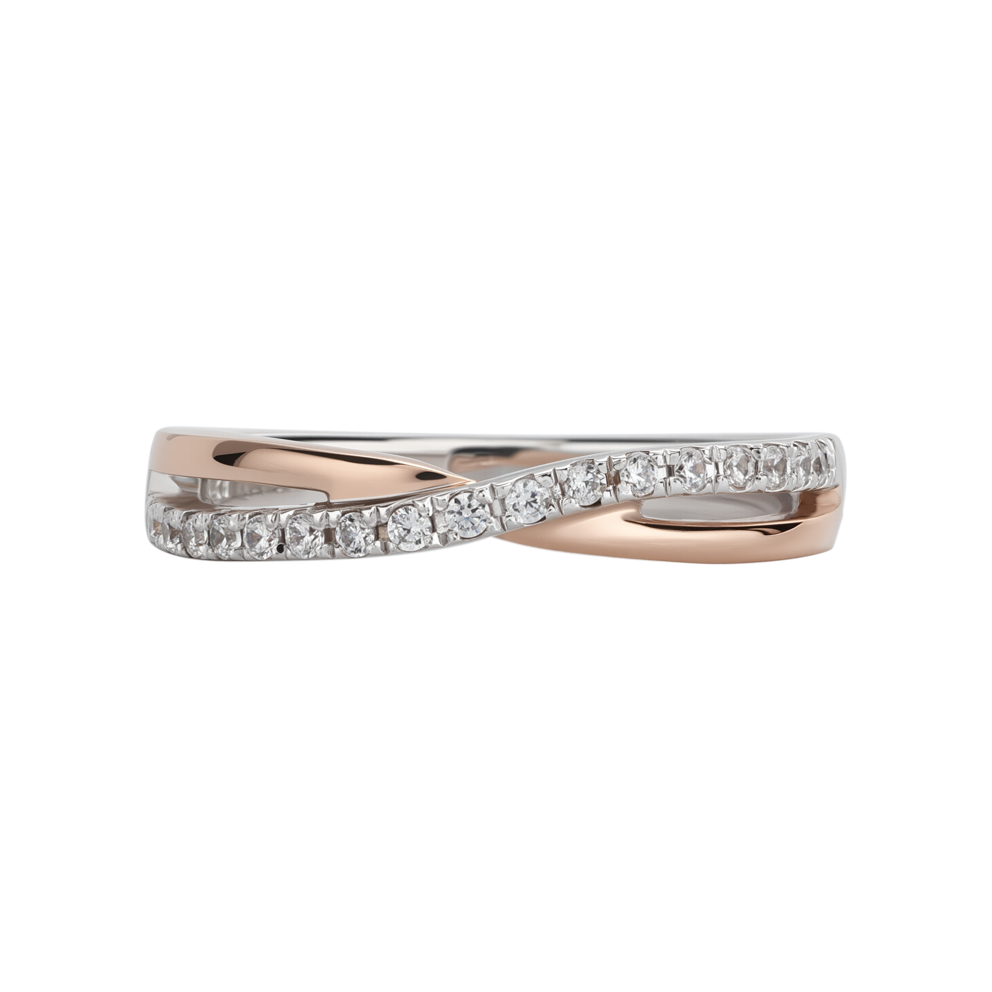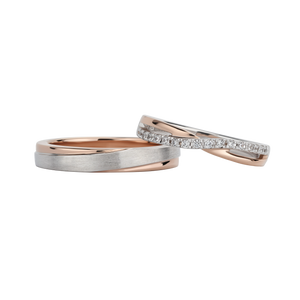 象徵愛情中最完美的默契與和諧。這款雙色對戒以交錯的線條設計展現兩人情感的交織與融合,男戒簡約大氣,女戒則以排鑽設計增添璀璨華麗,完美詮釋愛情中的相互扶持與心靈契合的永恆承諾。